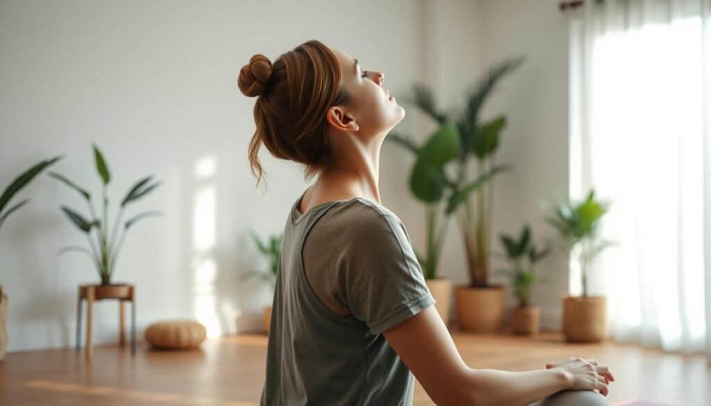 The neck release exercise is a simple yet effective way to alleviate tension and pain in the neck and shoulder area. It’s great for those who spend long hours sitting at a desk or driving. These activities can lead to tightness and trigger points in the upper trapezius muscle, potentially causing headaches14. Neck and shoulder pain affects a significant percentage of the population, impacting daily activities such as driving, working on the computer, playing sports, and even sleeping15.