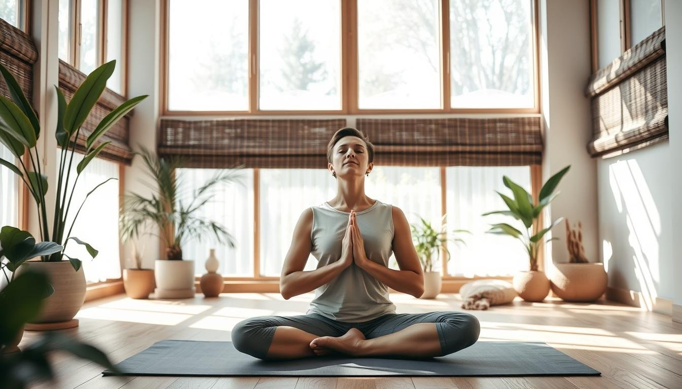 Getting ready for yoga is key, especially if you’re new to it. Learning to breathe right and setting goals helps you focus. A 2021 study showed that cells can feel and react to things26, showing yoga’s power to improve health.