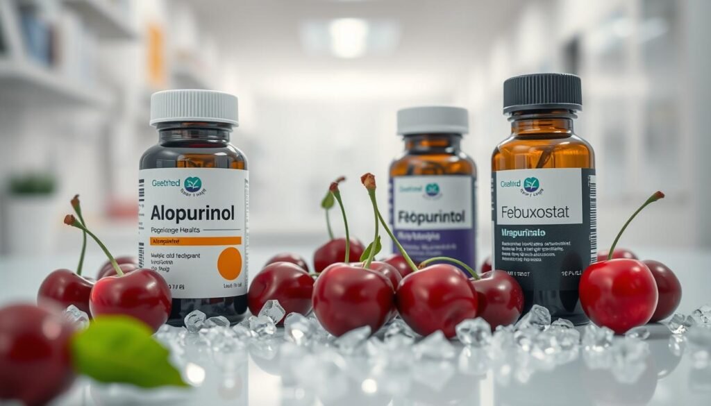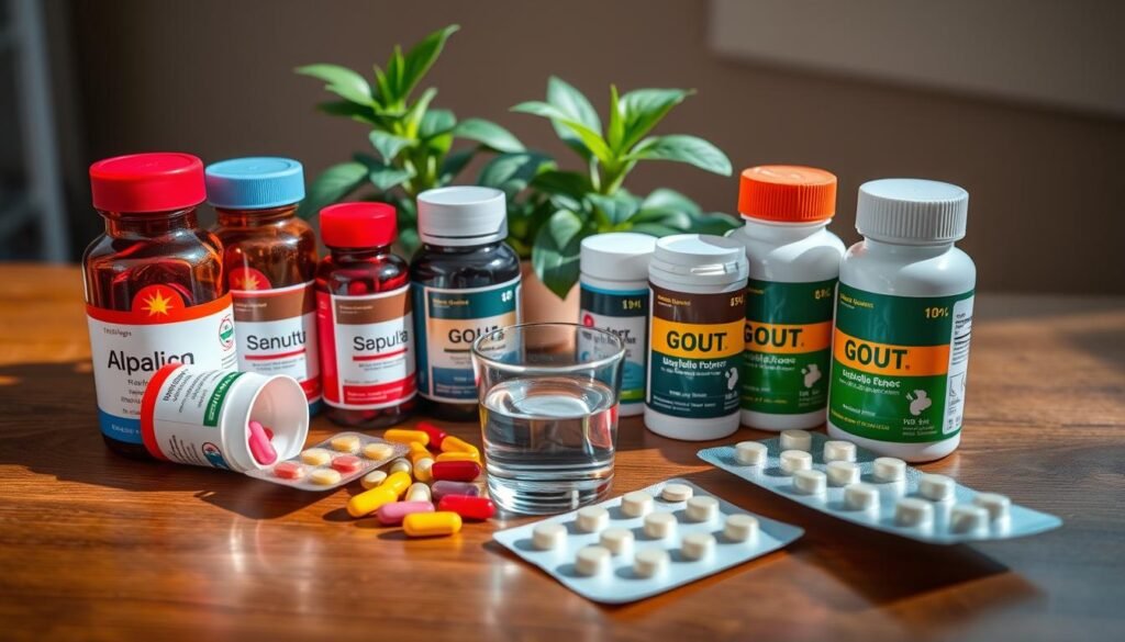 Your healthcare provider will help pick the right treatments for you. They consider how severe your gout is, your overall health, and any other health issues. NSAIDs and colchicine are often first choices for sudden gout attacks. Allopurinol is usually used at 300 mg/day for long-term gout19. It’s important to talk about the good and bad sides of each medicine with your provider.