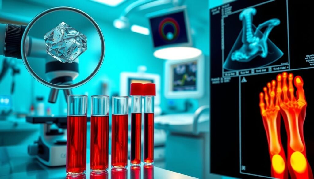 Doctors look at symptoms and the joint’s appearance to diagnose gout. They might take a joint fluid sample to find urate crystals. Blood tests check uric acid levels, but they can be tricky. X-rays and other scans help see the crystals and rule out other problems.