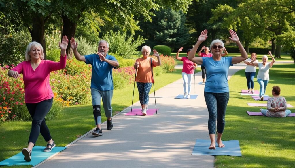 Low-impact exercises like walking, swimming, and cycling are great for most with osteoarthritis21. They strengthen muscles, improve flexibility, and cut down on pain22. Aquatic exercises in shoulder-height water ease joint pressure and build muscle strength21.