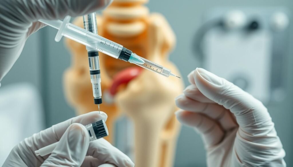 Corticosteroid injections can give quick pain relief and better function for a short time. They’re good for acute pain, joint swelling, and inflammation. Hyaluronic acid injections might offer longer relief, but their effectiveness is still up for debate.